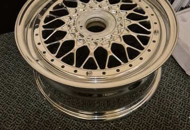 Polishing is a time intensive process with multiple stages to achieve the absolute highest quality results. Before the wheel gets near the polishing machines we need to totally strip it of any paint, lacquer and dirt back to bare aluminium and make sure that it is 100% clean. Then, by hand, we prepare the wheel, removing blemishes and rubbing down the entire surface.